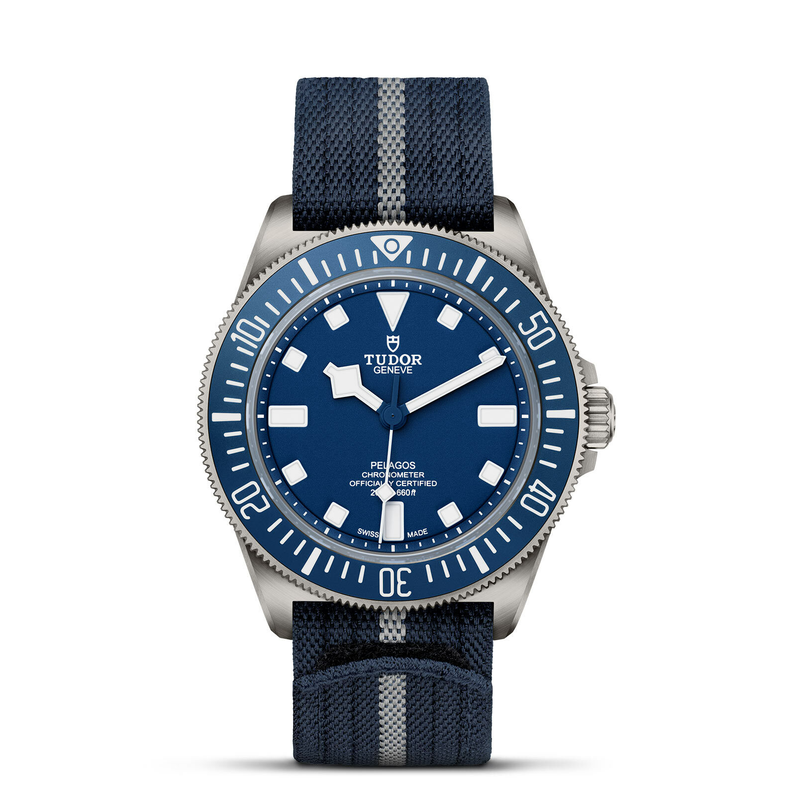 Cinturino in tessuto blu navy con filo centrale color argento, dotato di sistema di chiusura a strappo. Cinturino addizionale in caucciù blu navy con motivo tessuto e fibbia in titanio, incluso nell’astuccio