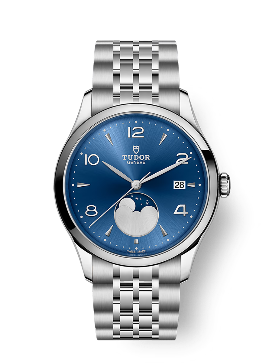 Quadrante blu, finitura satinata soleil, con numeri applicati e indicatore delle fasi lunari